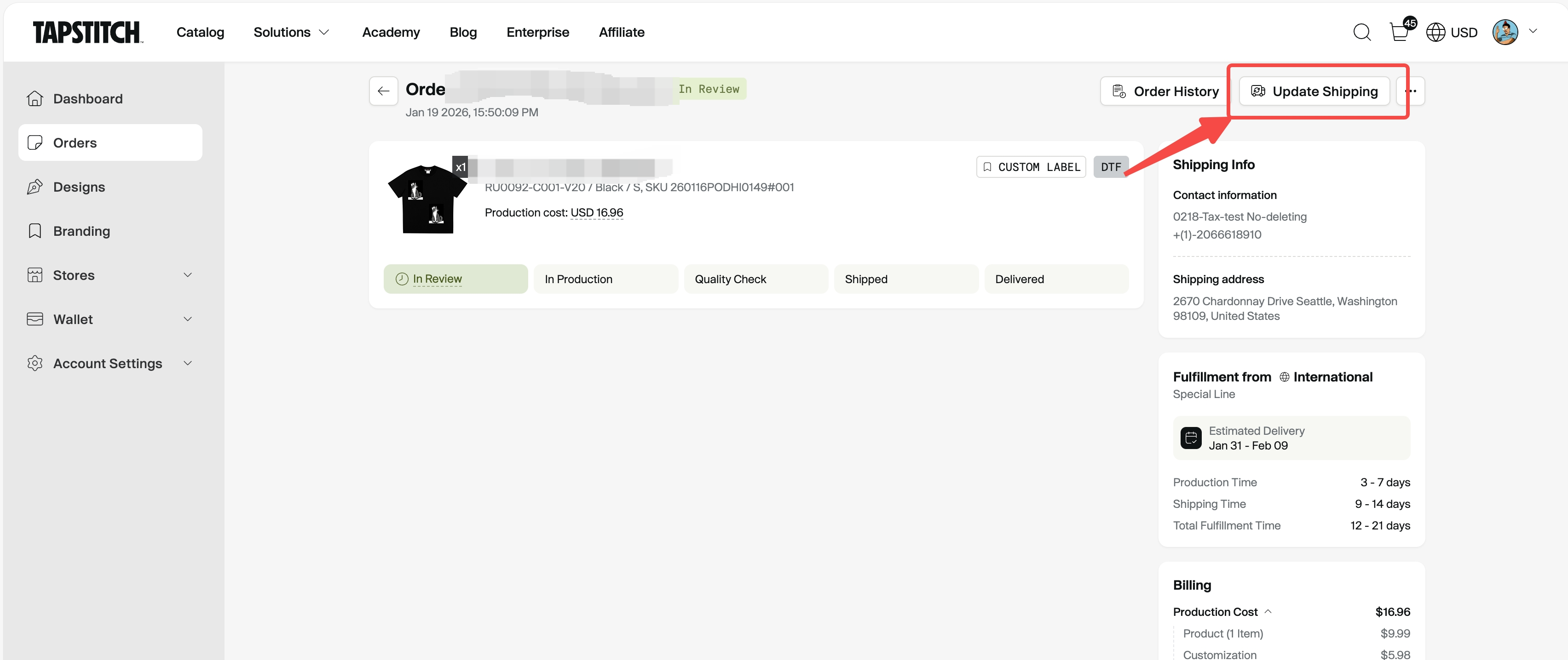 - US Fulfillment orders: The shipping address can only be updated to a U.S. address