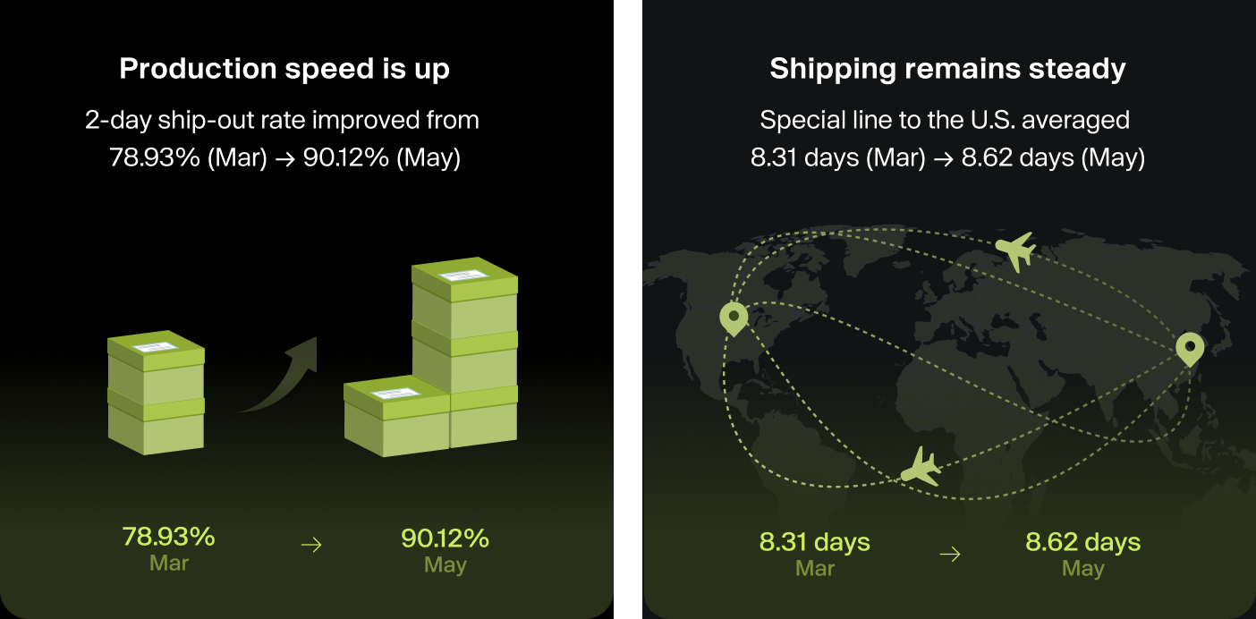 Production: The 2-day ship-out rate rose from 78.93% in March to 90.12% in May.